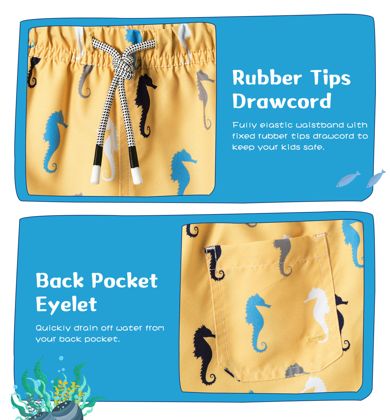 【Design】 Elastic waistband with fixed rubber-tip drawcord and silky mesh lining. Two front pockets with mesh interior and one back pocket with eyelet to let water drain.